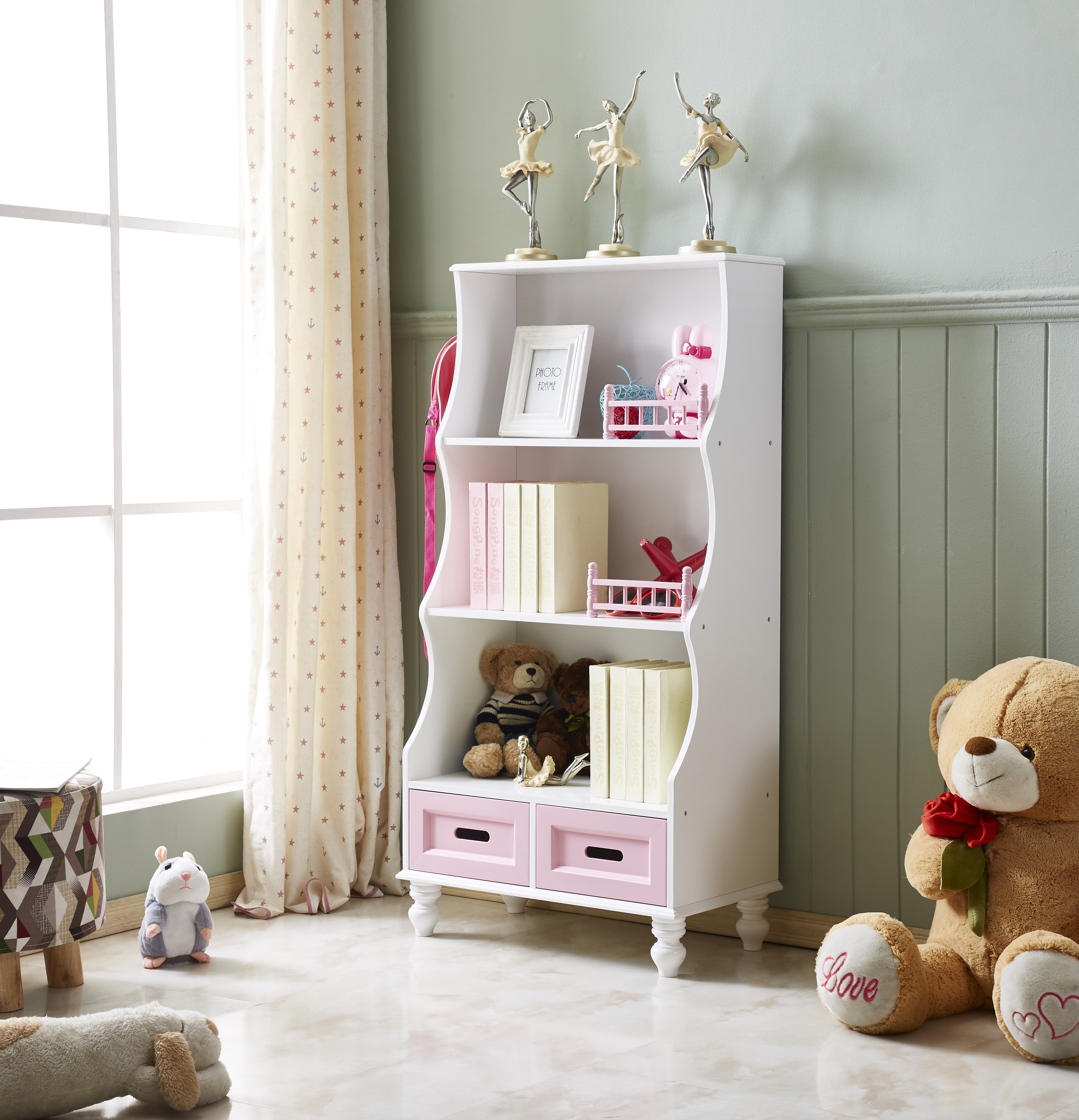 背の高い白とピンクのドールハウス用本棚_TY2008